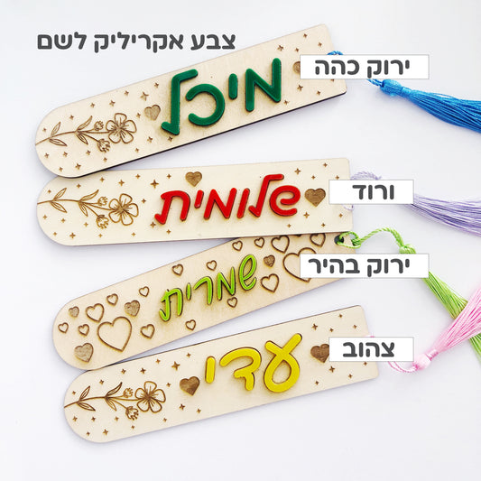 סימנייה אישית מעץ עם שם אקרילי וגדיל